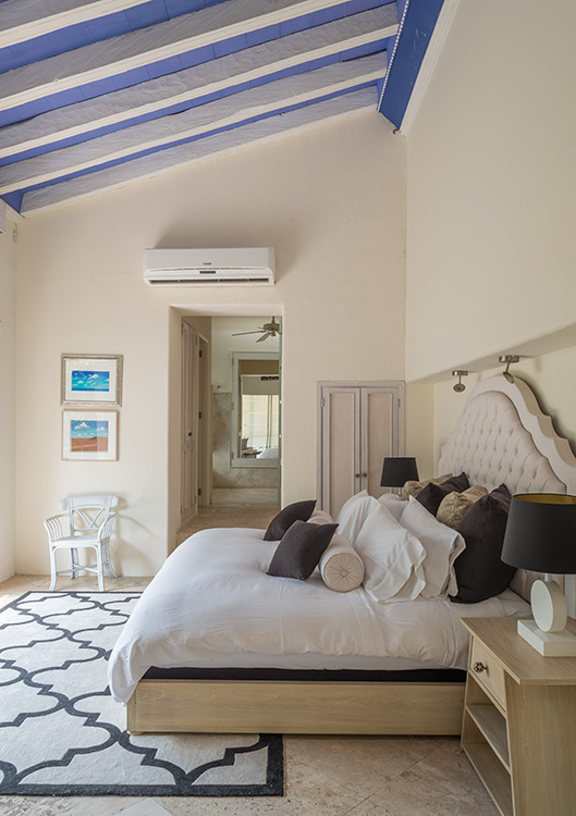 De esta manera también lograron implementar un diálogo y un lenguaje común con la sala principal, que comparte este ambiente. “Las dos áreas están divididas por un par de sillas tapizadas en lona costeña prelavada y una mesa auxiliar de hierro y vidrio, ambas creación de Mishaan, ideales para tomar el té o un trago después de cenar”.