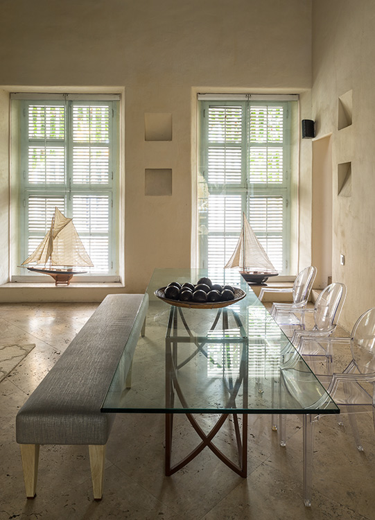En la sala principal se logró un ambiente acogedor y sofisticado, con una paleta monocromática basada en los tonos crema y hueso. Un amplio sofá en forma de “L” rodea una mesa de centro cuadrada, que articula el espacio. Llama la atención la limpieza formal que lo diferencia del resto de la casa, y contribuye a crear un ambiente de relajación y tranquilidad que contrasta con el ruido exterior, propio de las calles cartageneras. “Aquí apreciamos un alineamiento entre elementos, que crean un balance en una zona donde hay dos áreas de uso. Alineamos el punto de foco que es la fotografía de la artista Adriana Duque, con el comedor, la lámpara de espejo anticado y el sofá, tapizado con una combinación de algodón y lino, de la firma norteamericana Duralee”. Este espacio está aislado del comedor principal por unas puertas correderas de vidrio que no sacrifican la luminosidad de la zona y mantienen el lenguaje contemporáneo.