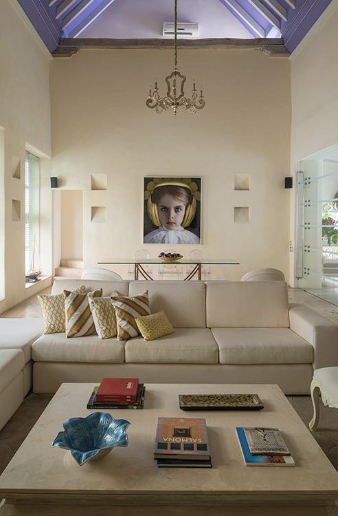 La columna vertebral del proyecto fue la pasión de los dueños por el arte y el diseño. Mishaan lo define como “un concepto atemporal con un toque surrealista. Hay ciertas piezas de mobiliario muy artísticas, además de las obras exhibidas. Es la identidad de sus propietarios, y esto se refleja en el lenguaje de la casa”. Los materiales se eligieron de acuerdo con su durabilidad y resistencia al exterior. Predominan las telas de la marca española Romo, la madera wash de poro cerrado y el vidrio. Es interesante también cómo el área de la piscina y el jacuzzi se articulan como extensión de la zona social, brindándole amplitud y unidad a la casa.