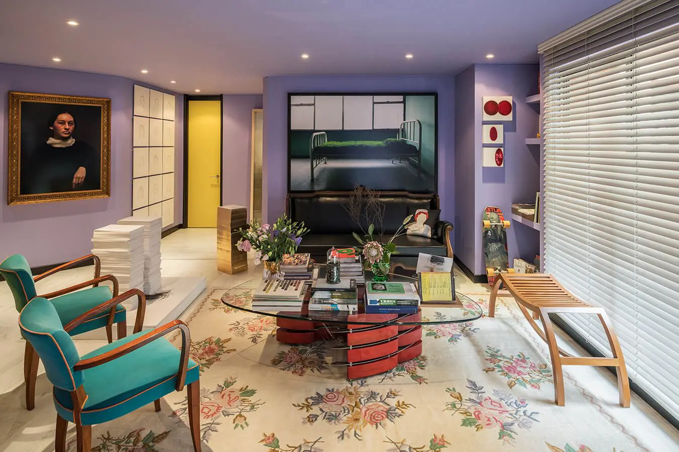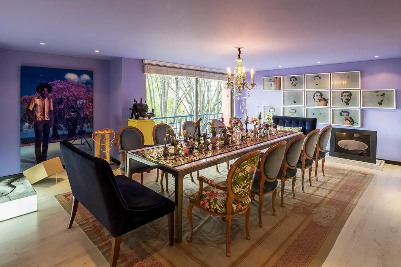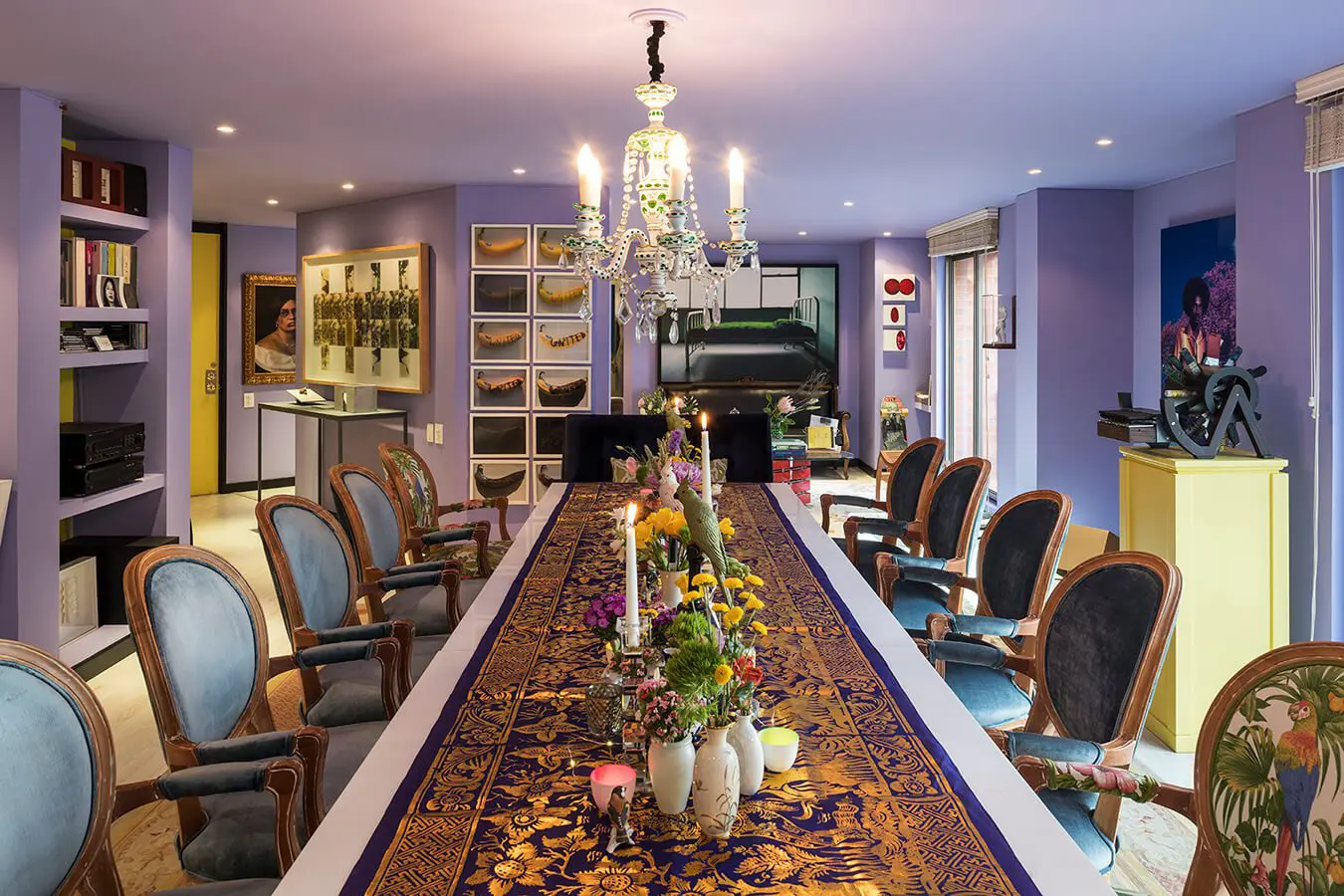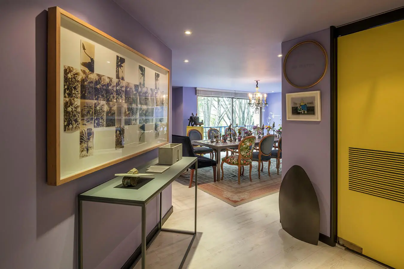 Saldarriaga es consciente de que intenta conjugar opuestos. Por eso, los tonos violáceos contrastan con el amarillo que tiñe uno que otro elemento (paredes, puertas, mesas, etc.), agregándole luminosidad y brillo al conjunto. “Antes no me habría atrevido a jugar con los colores. Sin embargo, hace un par de años empecé a descubrir las cualidades del color. Aprendí, por ejemplo, que arriesgarse a pintar las paredes con tonos divertidos resulta más fácil que intervenir los espacios”.Un exclusivo apartamento bogotano que combina obras de arte contemporáneo con muebles antiguos