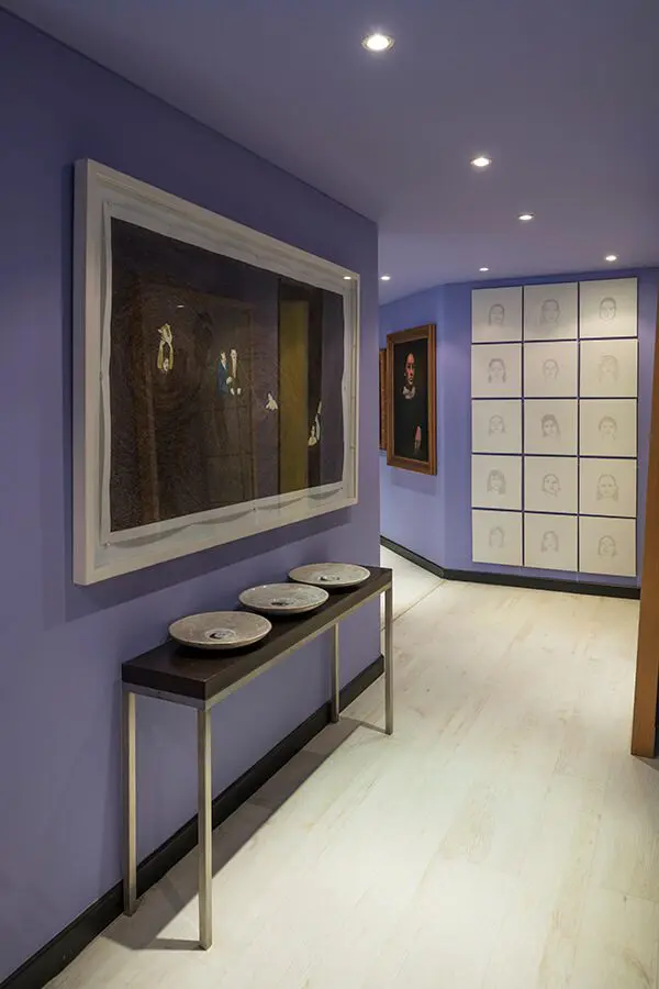 Los colores de los muros de su hogar, en el norte de Bogotá, traen a la memoria imágenes del arquitecto mexicano Luis Barragán. Tal vez aparezcan tonos como el rosado y el amarillo, característicos de su obra, así como de la cultura y el folclor de su país. Aquí, los purpúreos definen la paleta de color; el malva hortensia –que representa la feminidad poderosa–, cubre las paredes y el techo de prácticamente todas las áreas. “El reto no se limita al hecho de poder convivir con un tono así, sino a su propio significado. Con esto no solo me refiero a la psicología del color, sino a la sensación que me produce y los recuerdos que evoca un tono u otro”.Un exclusivo apartamento bogotano que combina obras de arte contemporáneo con muebles antiguos