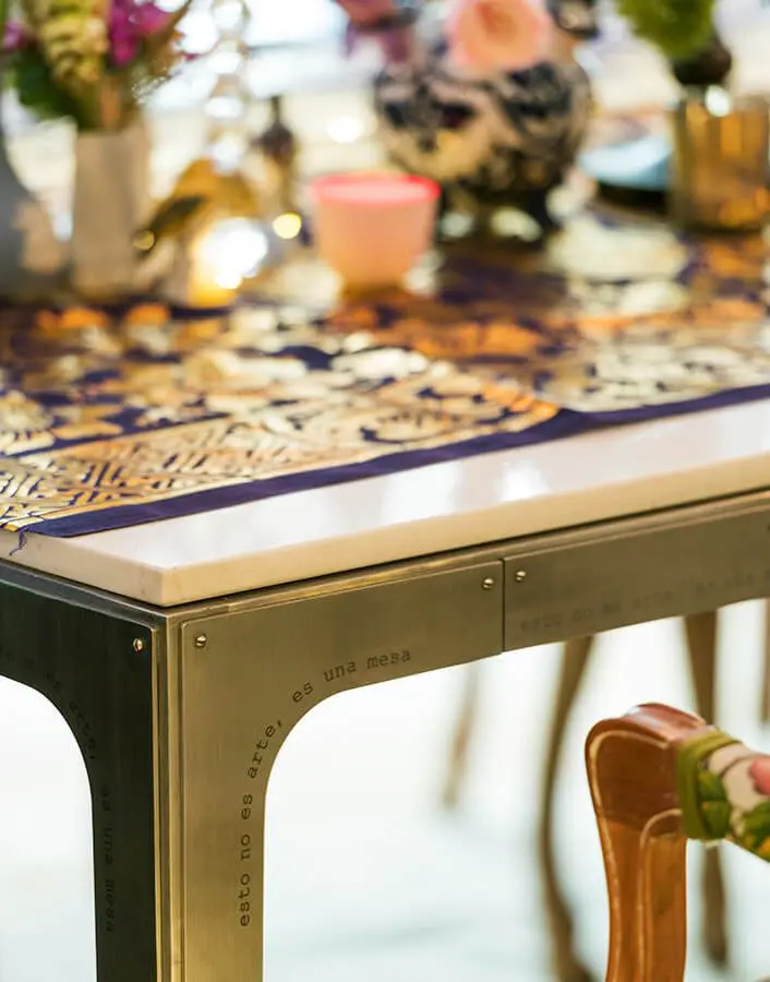 La mesa, obra del diseñador bogotano Andrés Aitken, sobresale por sus dimensiones. Se compone de una gran pieza de mármol y una estructura de acero que, aunque presenta una apariencia grácil y ligera, es capaz de soportar con apenas cuatro apoyos el peso de la lámina. Está grabada con la frase “Esto no es arte, es una mesa” a lo largo de la base metálica, como si se tratara de contradecir una repetida interpretación. Así, lo útil y lo bello se enlazan en un todo que reivindica con naturalidad el arte, virtud de la que carece gran parte de este tipo de muebles. Un exclusivo apartamento bogotano que combina obras de arte contemporáneo con muebles antiguos
