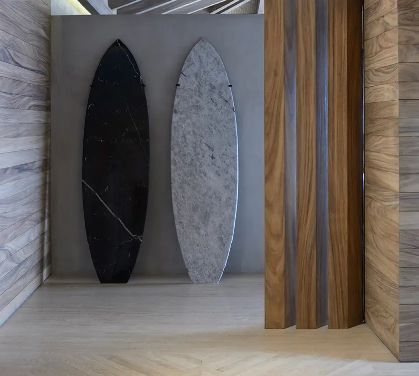 Para ingresar a esta vivienda de descanso de dos niveles, los invitados deben tomar un ascensor que entrega al hall de acceso en el segundo piso –donde están contenidos los ambientes sociales–. Allí, una celosía de madera, dos tablas de surf hechas con mármol a manera de esculturas y muros recubiertos de madera parota componen este lugar que se convierte en el abreboca del espacio más importante: el salón. A diferencia de otros proyectos, el primer piso está reservado para albergar las cuatro habitaciones. El salón cuenta con uno de los trabajos de remodelación más destacados del proyecto.