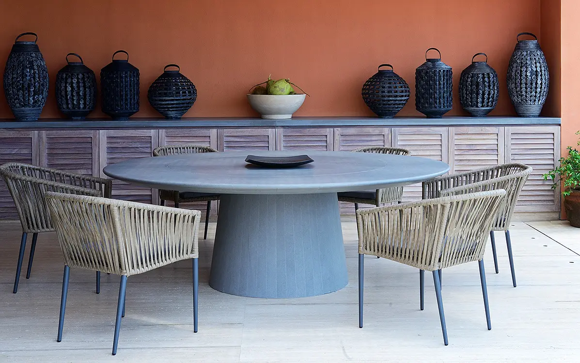 Aquí los materiales protagonistas son la madera parota utilizada en la mayoría del mobiliario –también recubre algunas paredes–, el mármol Travertino Veracruz en la totalidad de los pisos –incluso para enchapar la piscina– y la técnica de baba de nopal para los muros. Esta última es “un acabado muy artesanal, una mezcla de concreto con pigmentos que se aplica con mucho cuidado y que, al final, da la textura del estuco. Su resultado no es muy uniforme para que dé volumen a los espacios. La utilizamos en toda la casa, menos en la fachada”.