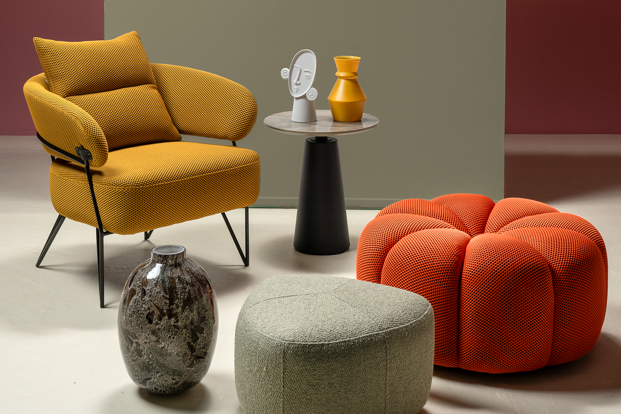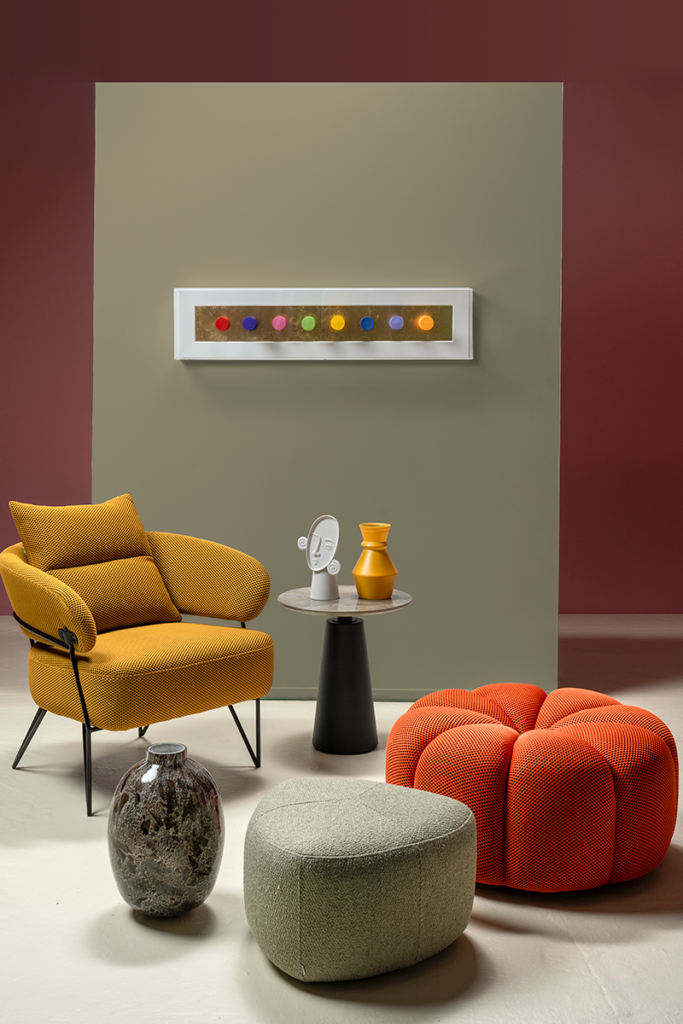 Este espacio se complementa con la obra Alegría, medidas 112 22 15 cm, de Juliana Bernal Jaramillo. De izquierda a derecha encuentra el sillón en la referencia Peppo Amarillo; sobre la mesa, jarrones Curly Head y Gina Amarillo; taburete Peppo Lounge Naranja, todo lo anterior lo encuentra disponible en Kare.