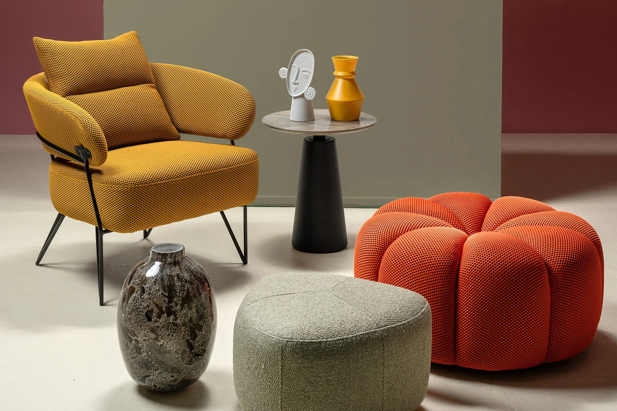 Adelante se ubica un puf, referencia Bermuda, tela Lazio verde claro; en el piso, jarrón Amass gris/arena y mesa auxiliar Madrid, de cerámica marrón, todo lo anterior de la marca BoConcept.