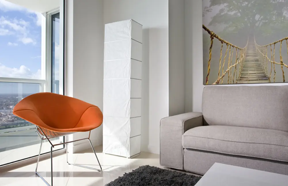 Para lograr, en el piso 43 de un moderno edificio, esa atmósfera vanguardista de estilo minimalista pero acogedora, el apartamento de diseño minimalista en el distrito financiero de Miami se reconfiguró como un único ambiente, en donde la vista sobre la bahía se convirtió en protagonista. El mobiliario, funcional y de líneas sencillas, se escogió debido a un contraste cromático y de materiales que ayudó a conseguir la imagen deseada.