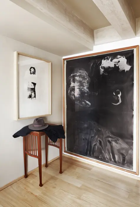 En la sala se destaca el famoso sofá Le Corbusier, que alguna vez hizo parte de la obra La visita, que Miguel Ángel Rojas montó en la biblioteca Luis Ángel Arango, y la silla vintage, de lana de oveja, del diseñador industrial Jaime Gutiérrez Lega, adquirida en un mercado de pulgas.