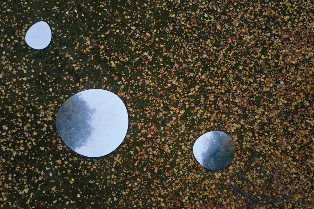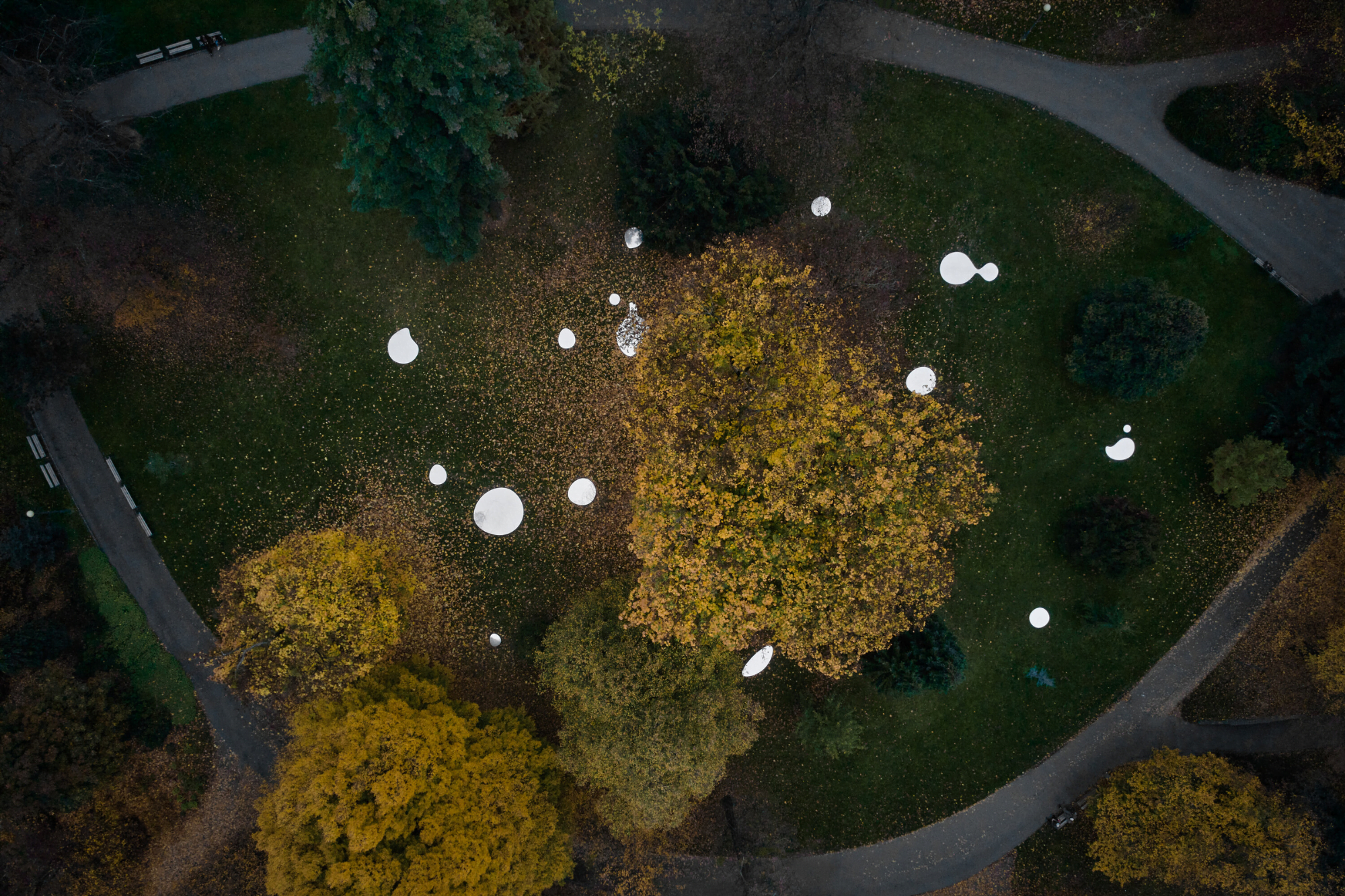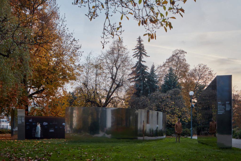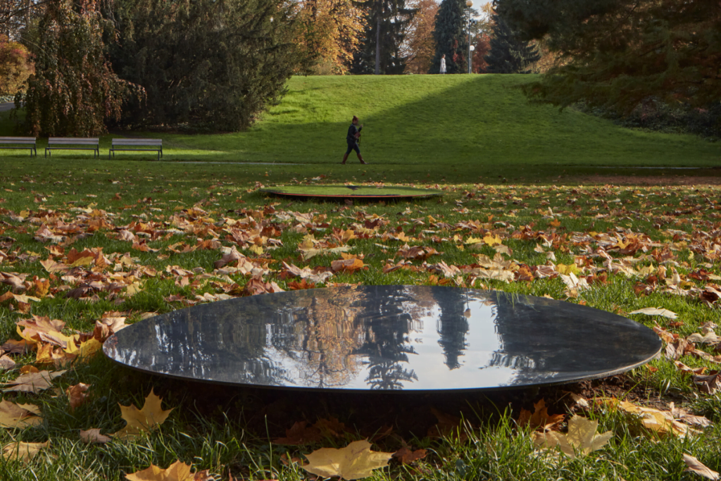 La última instalación permanente son los Espejos de Zlín. Una constelación lírica de formas fluidas, colocada poéticamente entre los árboles más hermosos del parque de Zlín. Este bajo copas de árboles y un cielo flotante.