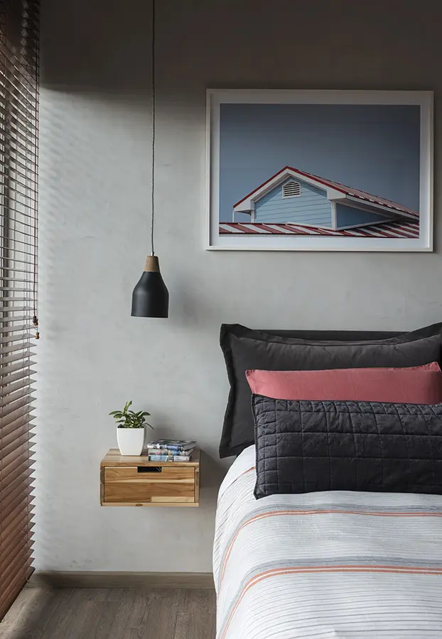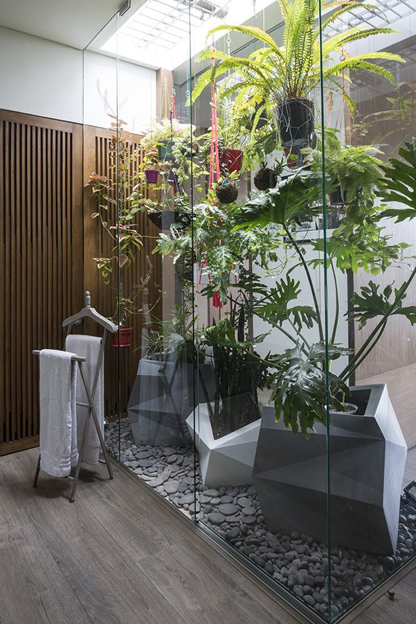 Entrando al área privada se encuentra el exuberante jardín interior, visible desde la zona social, que articula la circulación entre habitación, baño y vestier. Plantas de follaje intenso, sembradas en materas plegadas en forma de origami, se complementan con otras más pequeñas que cuelgan de la claraboya –sirve de soporte en la parte superior una reja antigua rescatada de una demolición–, y conforman un jardín verde y tupido. Su luminosidad y colores intensos llenan los espacios de luz y de vegetación mientras garantizan la intimidad en el uso. Los materiales utilizados en la habitación –microcemento gris claro (acabado mate) en las paredes, maderas de poro abierto en puertas y mobiliario, telas suaves y colores grises y pastel en la decoración– responden de manera serena a la intensidad del verde proveniente del jardín, generando una atmósfera distendida y en contacto con lo natural.