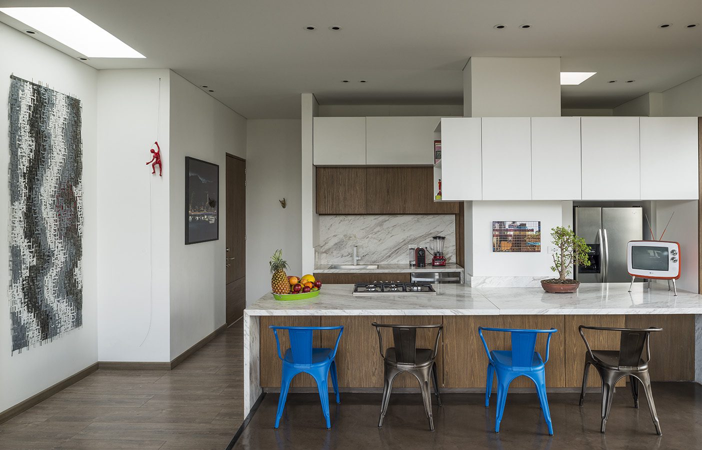 Al cruzar la puerta de entrada se abre inmediatamente la visual sobre un espacio social iluminado, fluido e integrado. El blanco es el color predominante en la cocina, reforzando las diversas fuentes de luz y resaltando, por contraste, las intensas texturas de la madera de los muebles y del piso, y las vetas del mármol Calacatta que sobresalen en el salpicadero y en el mesón. Este último, amplio y profundo, une y a la vez marca la separación entre el área operativa y la social. El cambio de nivel entre los ambientes recalca de manera sutil este límite, y permite que el mesón sirva como zona de trabajo hacia la cocina mientras se percibe como comedor auxiliar (de altura normal) hacia la sala, generando mayor fluidez e interacción a la hora de preparar los alimentos y de comer.