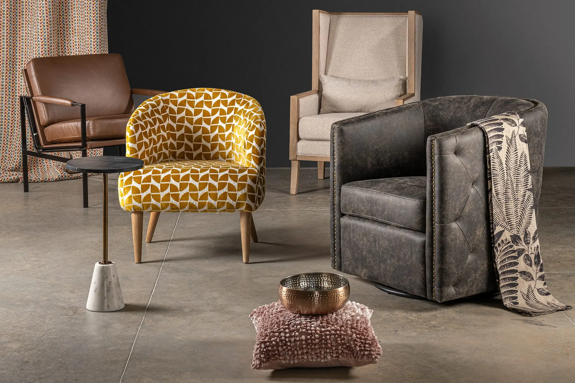 A la derecha, poltrona en la referencia Ryandale, con marco de aluminio fundido en acabado negro antiguo; en el medio, sillón Janesley, con tapicería de poliéster naranja y crema, con diseño de rombos, patas de madera en acabado negro, todo lo anterior de la marca Ashley.
