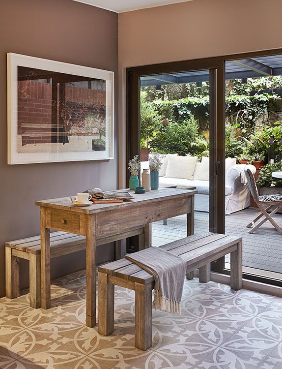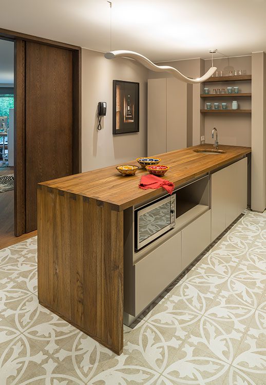 La cocina podría describirse como una sutil transición entre el exterior y el interior. Su piso, que recuerda las casas de las abuelas, mantiene el lenguaje cromático del resto del apartamento. “No queríamos que la cocina fuera fría, blanca, por eso tiene el tono taupé presente en los demás espacios, de tal manera que si se abre la puerta corredera y se integra a la zona social, el contraste no es fuerte”, explica Vernaza.