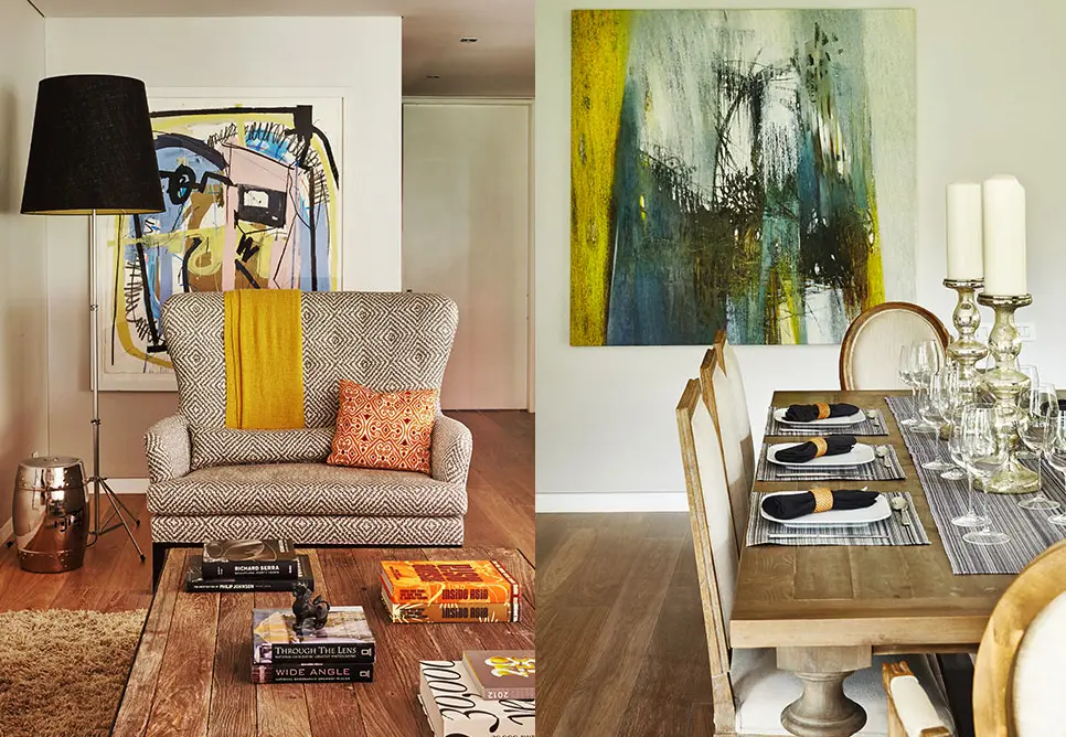 Esta propuesta, que apela a la sencillez, tiene un objetivo de practicidad: “Algunos cojines y throws son los que dan el color, lo cual permite que cambiando unos pocos elementos pueda transformarse el espacio y la sensación que genera, sin tener que recurrir a renovar todo el mobiliario”. En esta zona las miradas se centran en el imponente sillón doble, tapizado con una tela de la firma Robert Allen y diseñado por una de las fundadoras de Ecologik para un hotel en Los Ángeles cuyo interiorismo estaba inspirado en el libro Alicia en el País de las Maravillas.