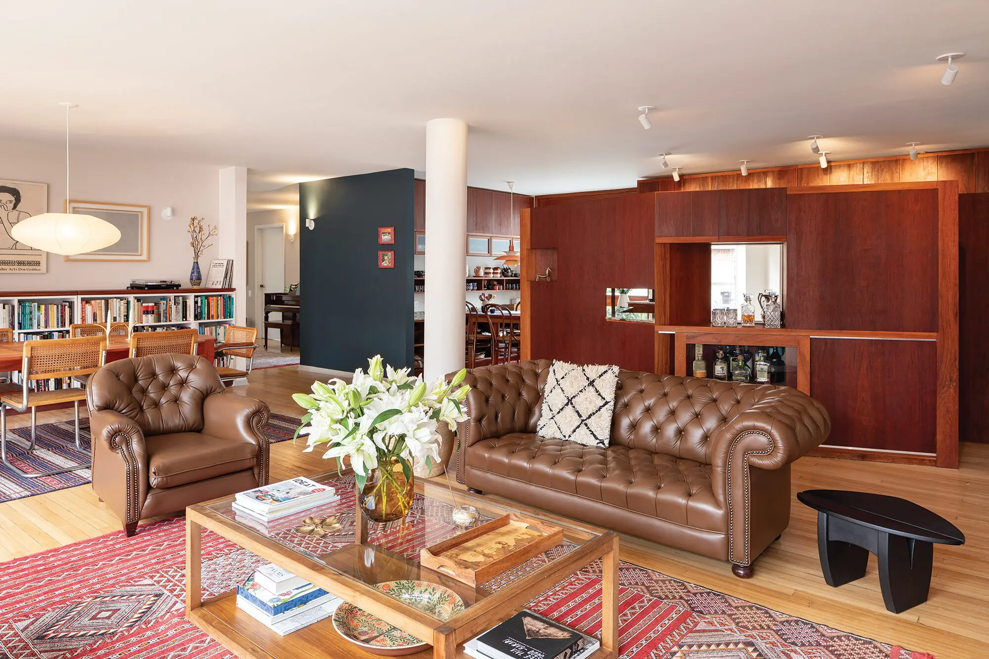 Los muebles que ocupan los demás espacios —sala, comedor, tres habitaciones y estudio— hacen eco del clasicismo del ambiente para el desayuno y del apartamento en general. “La mayoría se adquirieron antes de la remodelación, en tanto que otros se sugirieron como complemento a lo existente”. Estos se caracterizan por una paleta de colores sobrios, algunos opacos, otros claros, y el uso de materiales de origen natural, como el cuero y la madera.