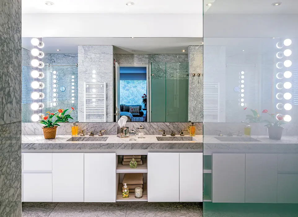 Para cumplir con estas expectativas, propusieron abrir y cerrar espacios, colocar luces indirectas y cambiar la tubería y algunos armarios. Además, reemplazaron los pisos para proporcionar un aspecto natural al entorno y así poder jugar con los tonos oscuros de la madera de la biblioteca –que se extiende y entra hasta el baño auxiliar para albergar una generosa serie de volúmenes que se multiplican con el reflejo del espejo, creando un efecto de prolongación– y tecnificaron el sistema de sonido.