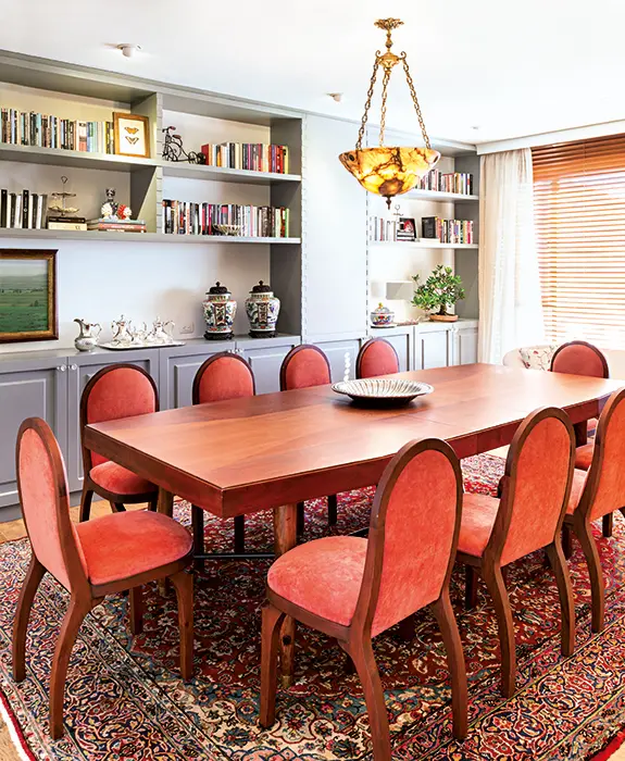 En el área social se logró un ambiente acogedor e íntimo gracias a los atributos de la madera –también presente en las persianas– y a las texturas de las grandes alfombras persas que están sobre el piso. En este espacio sobresalen las obras de arte, entre las que hay cuadros de reconocidos artistas como Luis Caballero, Antonio Barrera y esculturas de Fernando Botero, así como fotografías y libros de política, historia, ciencia, arte, diccionarios y enciclopedias, todo esto junto a algunos toques contemporáneos de decoración. “Hay muy poco metal, vidrio y ángulos rectos, lo que permite que esta casa se vea y se sienta amable, tranquila”, comenta el diseñador Pablo Bustamante.