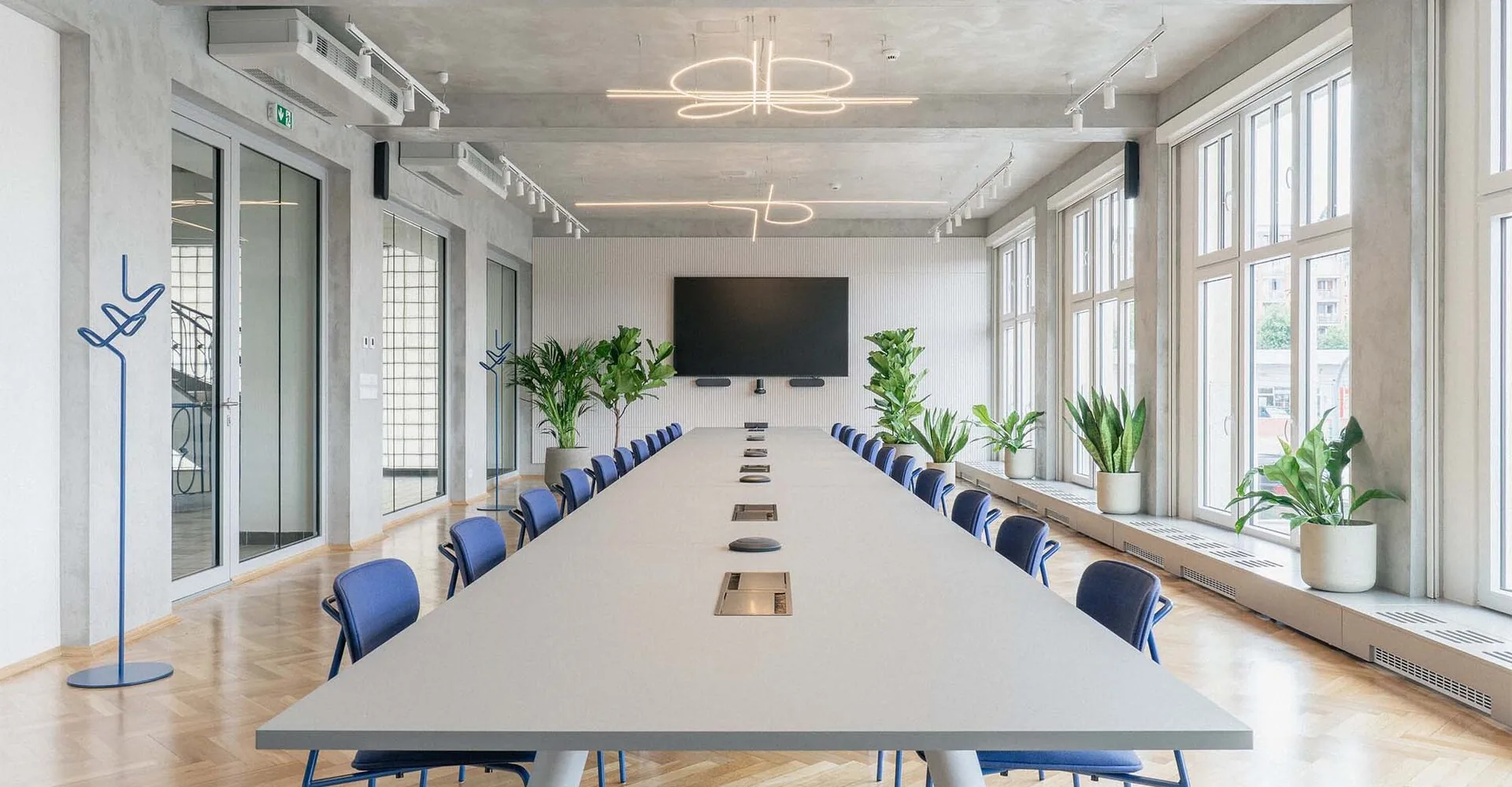 Los espacios renovados se limpiaron cuidadosamente de alteraciones insensibles: se eliminaron tabiques empotrados, falsos techos, zócalos y cableado de superficie. Detalles del diseño del edificio El interior fue restaurado a su forma y materialidad originales, se enfatizaron las cualidades sobre las que se construyó el edificio: una estructura de hormigón, luz natural y suelos de parqué de roble. Estos elementos fueron combinados conscientemente por los arquitectos con acentos de la identidad visual de la empresa para crear un espacio cohesivo y contemporáneo. Por otro lado, e logotipo original, con forma de cruce de caminos, fue rediseñado por KNOW HOW Solutions, cuyo trabajo sirvió como una de las principales inspiraciones de diseño. Los arquitectos de Studio COSMO reflejaron aún más la identidad visual de la empresa en elementos de diseño distintivos, como luminarias hechas a medida diseñadas específicamente para el espacio renovado. Sus formas hacen referencia a los cruces de caminos, el motivo principal del logotipo, vinculando simbólicamente el enfoque profesional de la empresa con la estética del interior. Los materiales utilizados realzan el carácter preciso y contemporáneo del espacio: la cocina americana cuenta con revestimiento de acero inoxidable y una isla de cerámica, mientras que la sala de reuniones incluye paneles de MDF personalizados que incorporan el logotipo de la empresa como patrón. Estos elementos únicos y el mobiliario a medida fueron suministrados por especialistas de la empresa Brick.