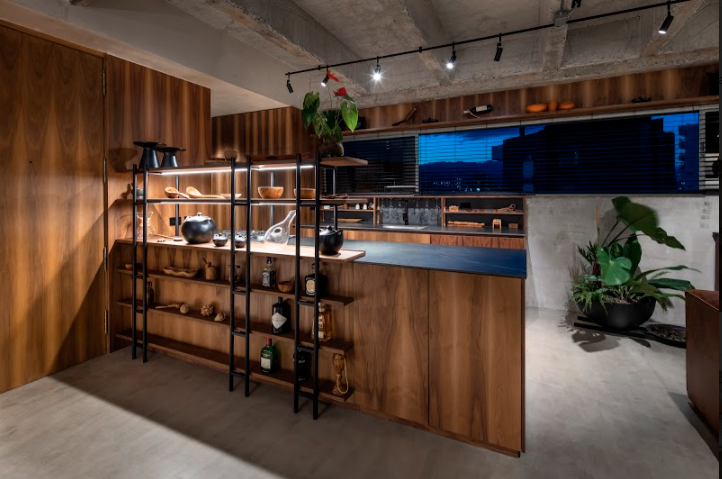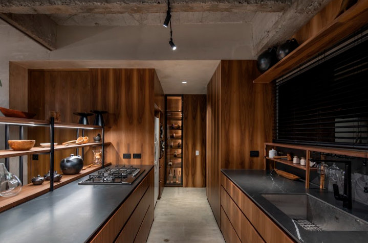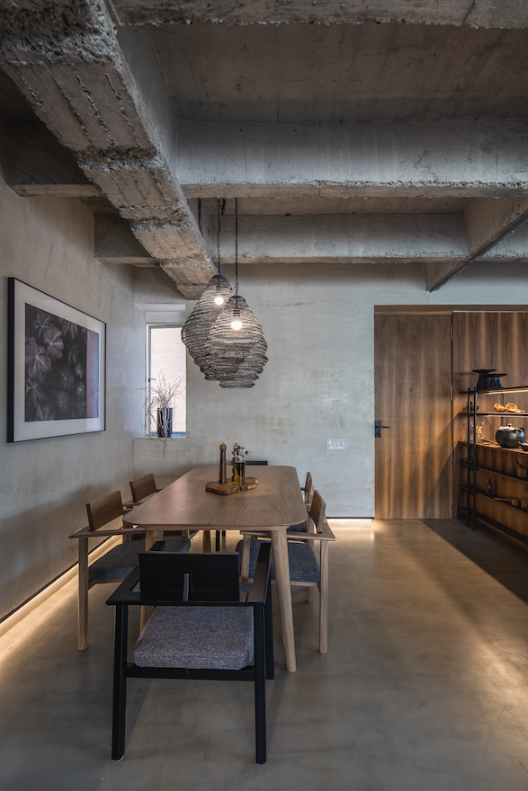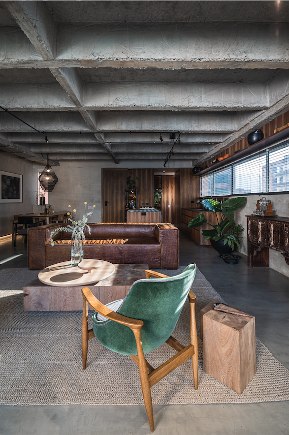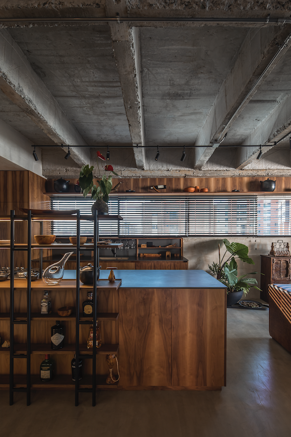 Al entrar, la perspectiva se abre hacia el balcón, y la cocina recibe a los visitantes con una estantería de acero y madera de la firma Vrokka, integrada a uno de los mesones. Las vigas y nervios de concreto expuesto crean un paisaje de rugosidades y líneas rectas, recorrido por un riel con iluminación para destacar los cucharones y vasijas como si fueran piezas de museo.