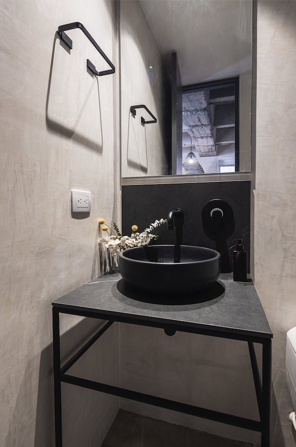 El piso de microcemento, vaciado sobre el acabado original, unifica todas las estancias como una superficie continua, mientras la madera de los muebles de la cocina contrasta con los tonos fríos de los muros y enchapa la pared de acceso hasta la puerta, mimetizándola. Los materiales y revestimientos se muestran como son, sin trucos ni maquillaje.