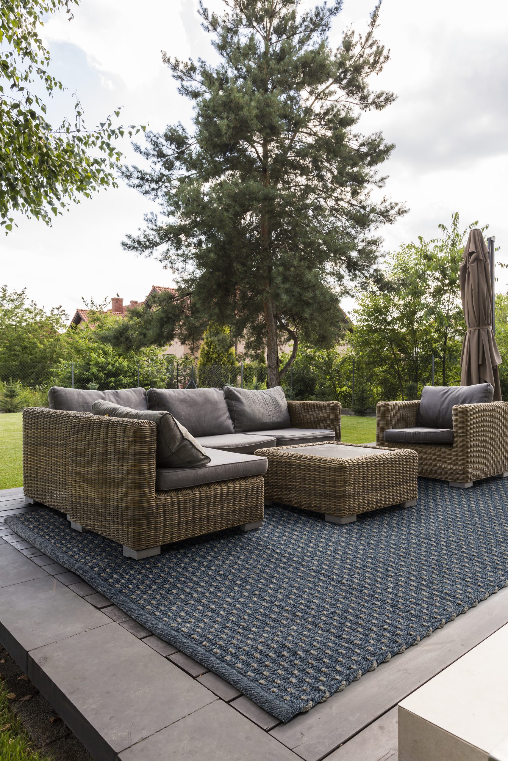 Este tapete está hecho en fibras sintéticas que generan mayor resistencia en exteriores. Su diseño y colores que van desde el azul, y colores tierra, se mimetizan entre ambientes campestres de colores naturales.