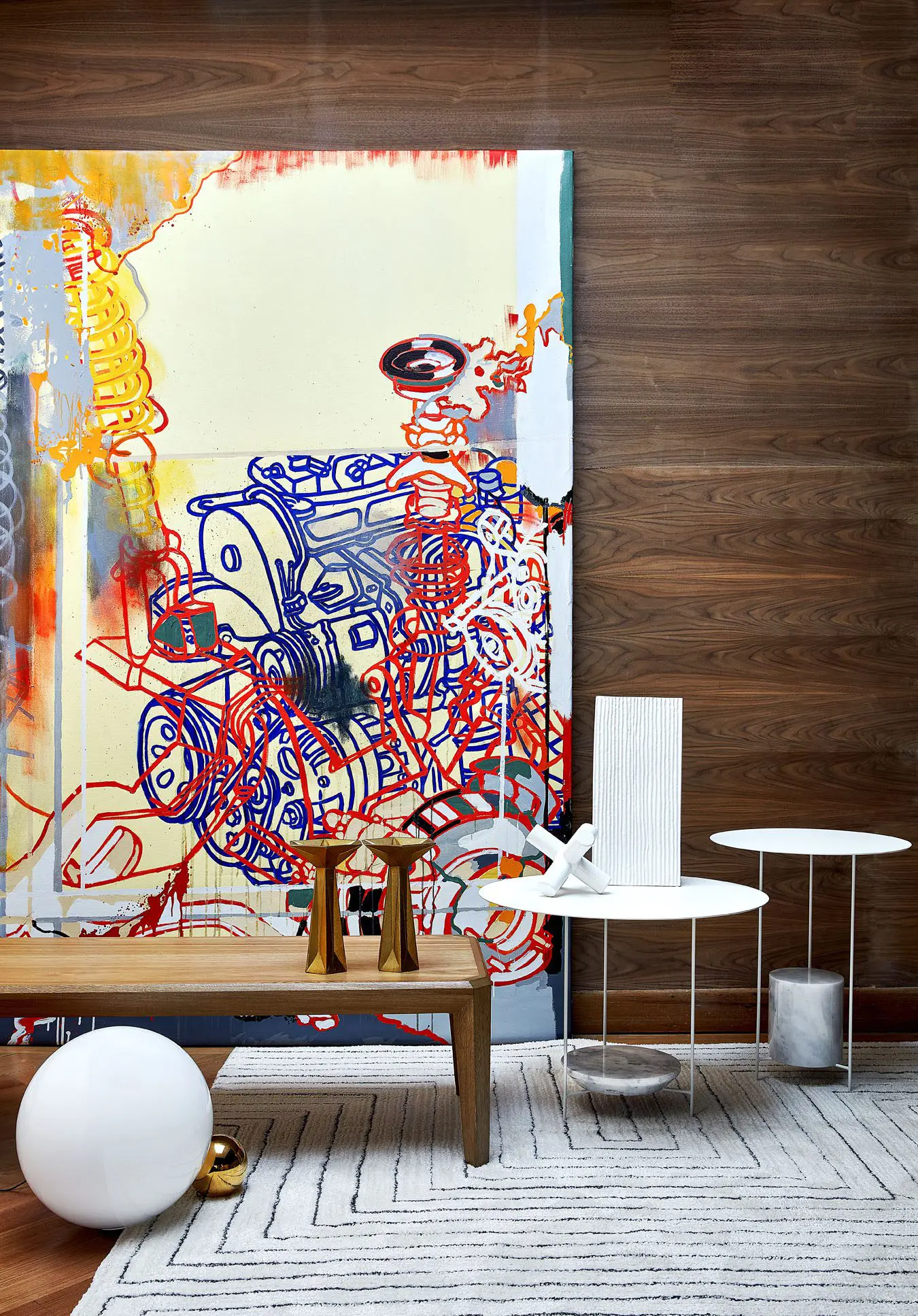 Tapete, ref. Fjord, de Tejidos LAV. En la esquina inferior izquierda,  lámpara de escritorio, ref. CopyCat, diseño de Michael Anastassiades para Flos, en Schaller. Mesa de centro, parte de la colección Ottomano; candelabros, diseño de Tom Dixon; obra de Jacob Karpio Galería, todo lo anterior en Zientte. Piezas decorativas de cerámica, de Bombox. Mesas auxiliares, ref. Panna Cotta de Ron Gilad para Molteni&C, en Schaller.