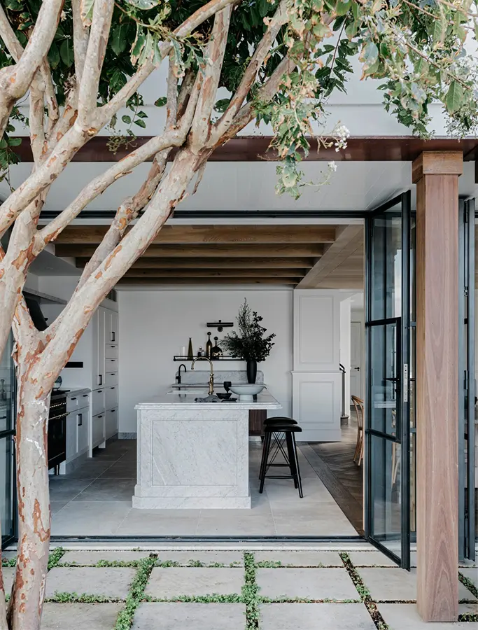 La vivienda, empujada hacia atrás desde el borde del agua, presentó desafíos, debido a esta falta de conexión física que era evidente en las propiedades vecinas. La idea central se centró en neutralizar el exterior de una manera que se ajusta con el paisaje para evitar desvirtuar la belleza del contexto circundante. Un enfoque contemporáneo y minimalista para el jardín permitió que la vista se convirtiera en el foco principal.