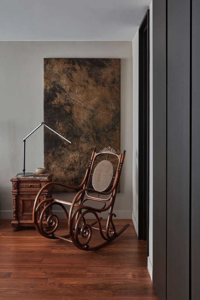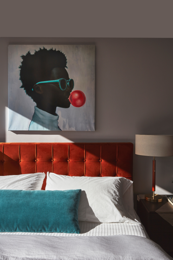 Por otra parte, cada habitación muestra un carácter diferenciado, ya sea a partir de un cabecero de cama clásico en cuero cámel contrastado con un color gris ébano de fondo, o con otro en terciopelo naranja complementado por un cuadro radicalmente contemporáneo. Pieza elaborado por el pintor alicantino Alexander Grahovsky. El arte es protagonista en las estancias, incluido el hall de acceso. Se exhibe como punto focal una de las primeras obras del artista bogotano Santiago Parra.