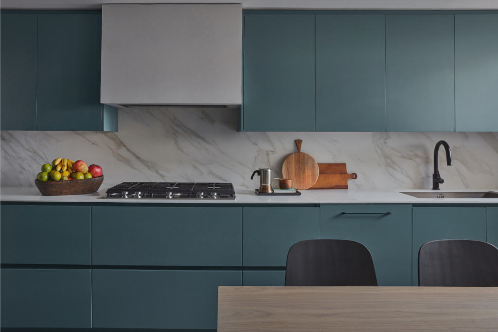 “Parece que Francisca quiere hacer la cocina azul, y creo que la voy a dejar”. Esta conversación, que tuvo lugar entre los propietarios del apartamento, expresa el nivel de confianza y tranquilidad que se generó en su relación con la diseñadora. El azul verdoso de este ambiente, una elección arriesgada y contundente, se complementa con las vetas y colores suaves del mármol calacatta para componer un espacio con carácter y personalidad.