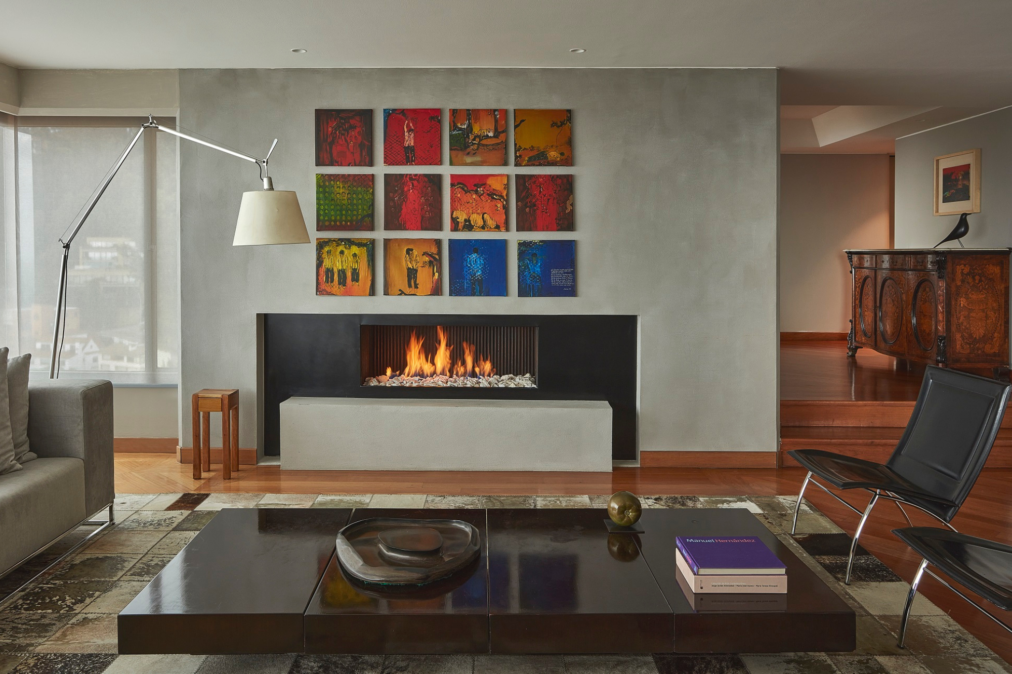 En el salón, en una de las chimeneas resalta un políptico de José Luis Quessep, mientras que sobre la otra se colgaron dos obras de Ana Mercedes Hoyos y dos más de Luis Caballero. Dispuestos a una altura perfecta. Esto para ser contempladas sentados desde el confort de la Lounge chair de los Eames o cualquiera de los sofás del salón. Obras de Negret, del mexicano Chucho Reyes, de Jaime Franco, Ramírez Villamizar y Hugo Zapata, entre otros, se encuentran en las distintas estancias del apartamento.