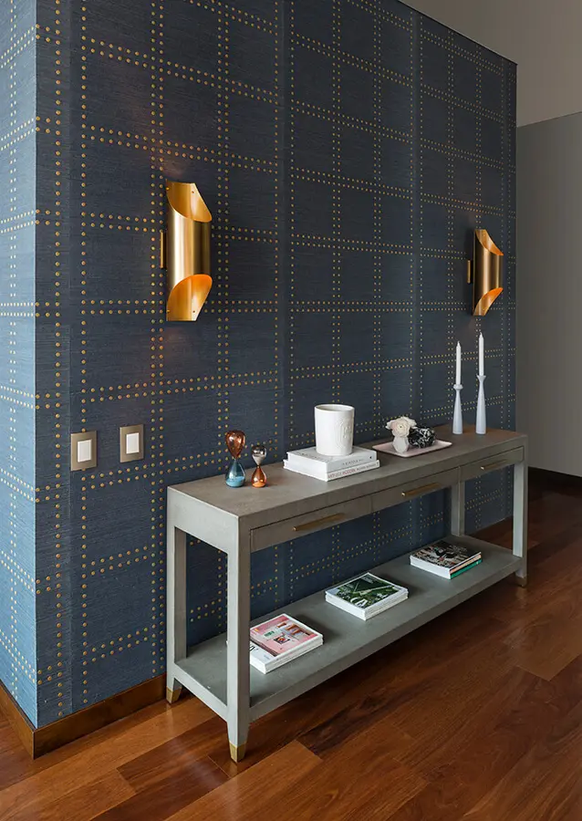“Buscamos que las piezas grandes y representativas tengan tonos y texturas neutros, complementadas con algunas pequeñas que pueden ser más atrevidas”, explica la bogotana Catherine Moggio, con referencia al lenguaje que emplearon en su diseño. Es así como la paleta utilizada parte de algunas variaciones del taupé, un color gris cálido, tranquilo y amable, que suaviza los muros de cocina y comedor mientras armoniza con los distintos acentos de la madera. La pared opuesta, que separa las áreas privadas de las más públicas, la revistieron con un papel de colgadura azul profundo.