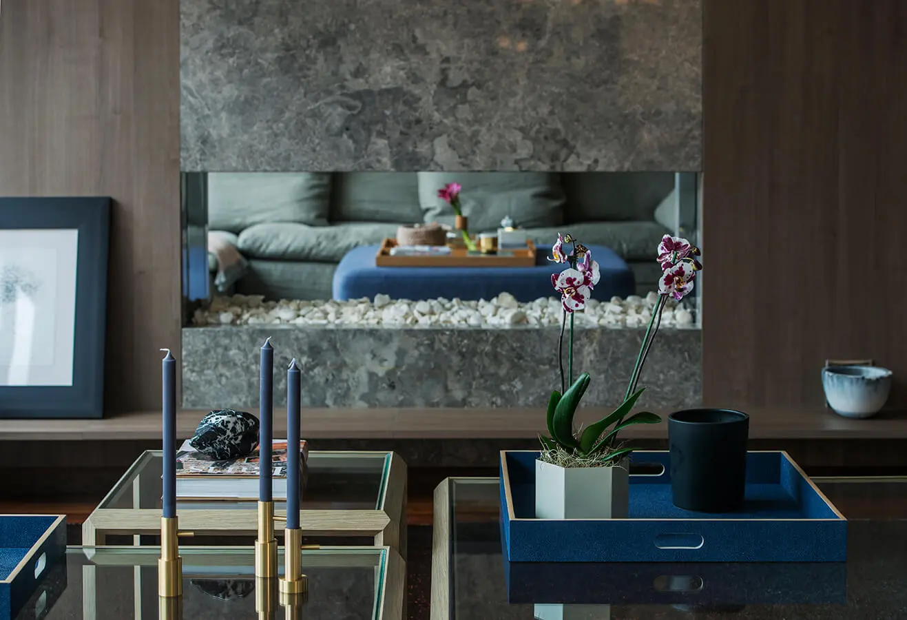 Fabricado con fibras naturales y con un patrón geométrico ejecutado a partir de taches dorados, su presencia contrasta con lo natural de la madera y el taupé, dándole alegría y personalidad a la vivienda. La chimenea, gracias a su ubicación y tamaño, tiene un papel protagonista. Recubierta en madera de roble europeo gris cenizo desde el suelo hasta el techo, resalta su posición en el hogar con un revestimiento de mármol silver grey, que exhibe orgullosamente la intensidad de sus vetas.