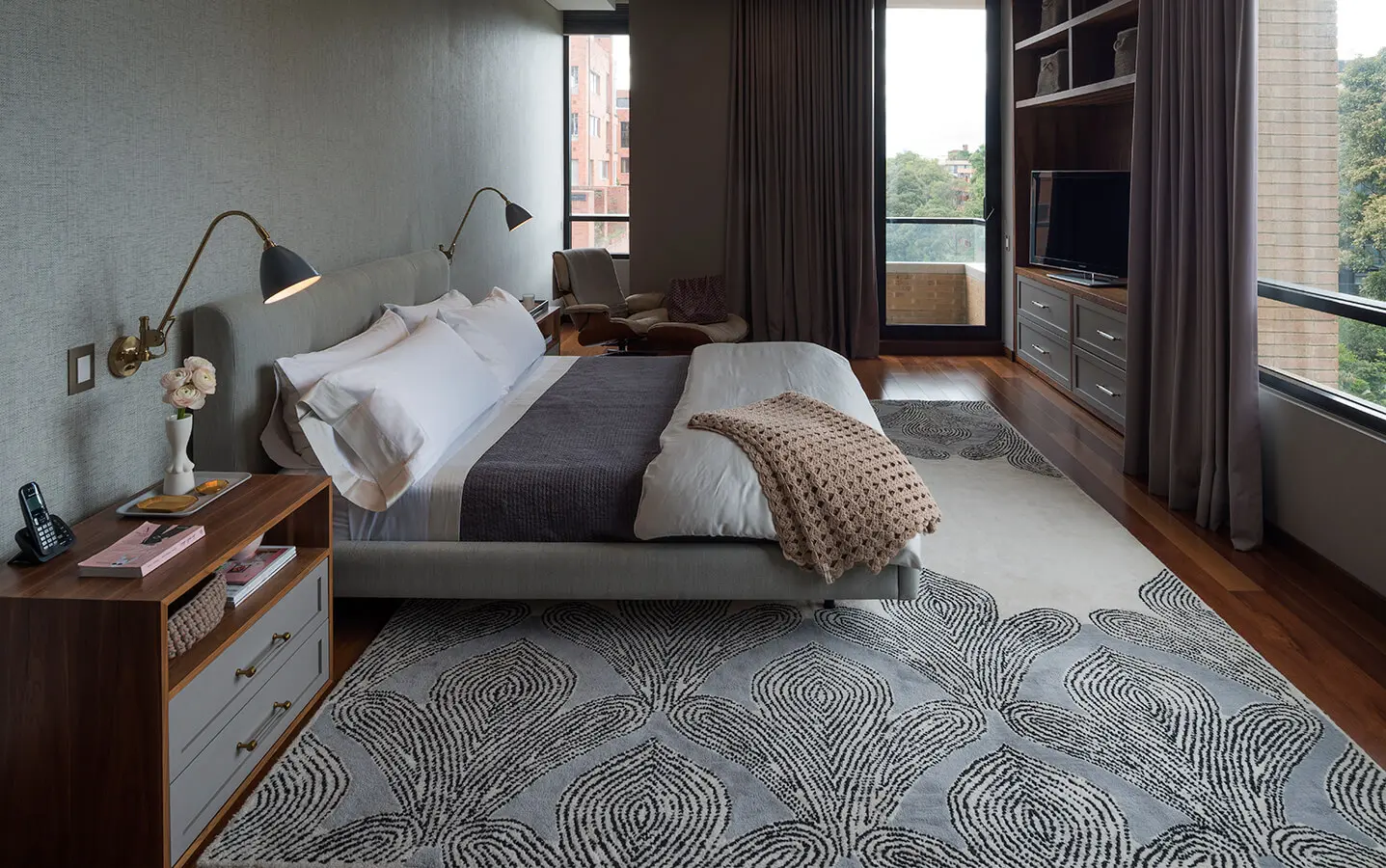 El otro protagonista de la zona social es el sofá. Diseñado por la arquitecta española Patricia Urquiola, sus líneas contemporáneas, y la textura y color de su acabado, definieron los tonos y geometrías de los demás elementos para ubicar en este espacio. El tapete, cuya creación y manufactura estuvieron a cargo del arquitecto colombiano Jorge Lizarazo, responde también a su presencia. Tejido en un solo telar, utiliza fibras de cobre y plata para generar un juego de luz, textura y color pensado específicamente para destacar en este lugar.