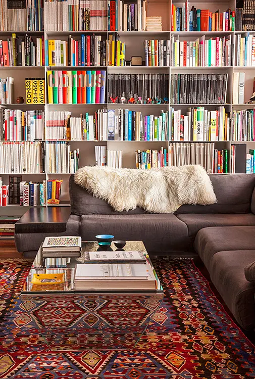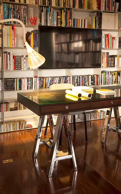 Pero como su colección era aún mayor –y con la proyección de seguir creciendo–, diseñó un mueble de gran formato para la sala y una estantería adicional para el estudio, un espacio de gran preponderancia para él que, como remate del salón, sintetiza algunas de las actividades más humanas, universales y placenteras: estudiar, leer, trabajar, descansar, crear, soñar.