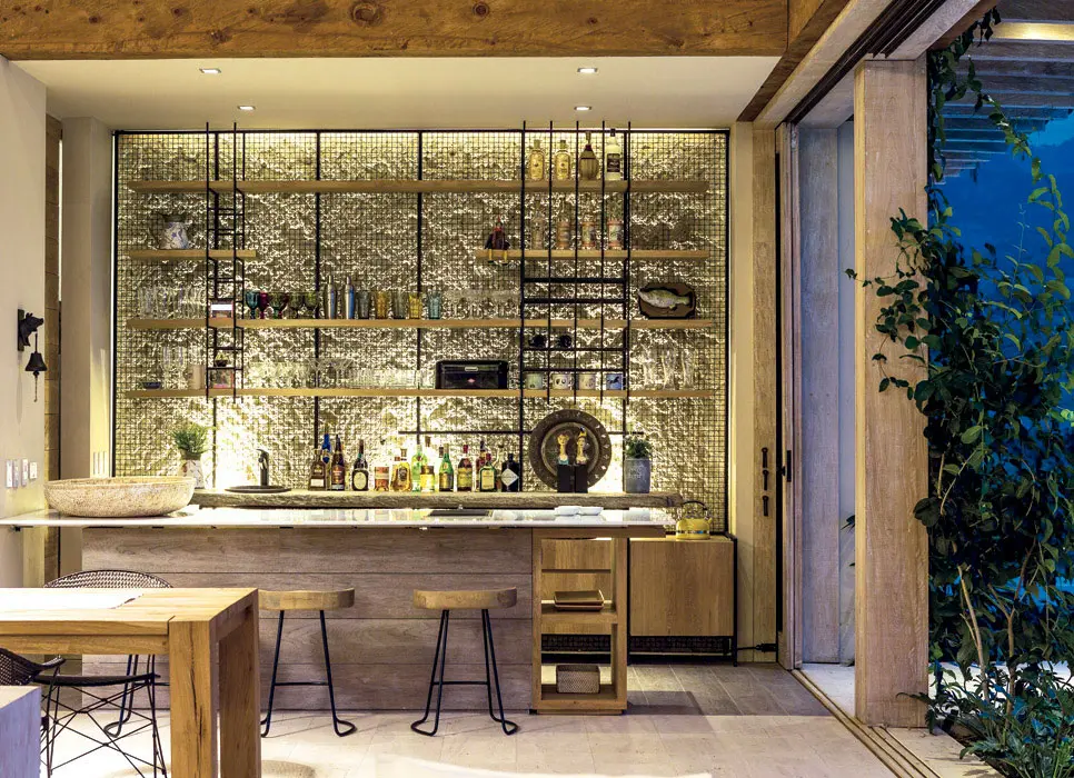 Para la decoración y el amueblamiento, los arquitectos quisieron expresar su gusto por los objetos y el diseño con una variada colección de piezas que muestran diversas formas y estilos de las culturas tropicales de varias partes del mundo: sillas de Bali, máscaras y telas africanas, y un baúl bajo y una plataforma de carga para poner en el lomo de un elefante, convertida en mesa de centro, de la India.