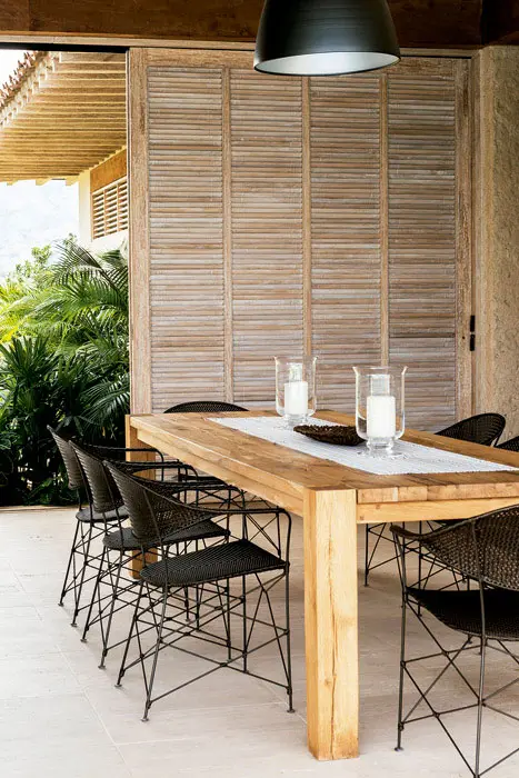 de Restoration Hardware, rodeada con sillas de metal y ratán, resumen el carácter de la casa. Los paneles deslizantes de madera regulan la abertura del espacio social.