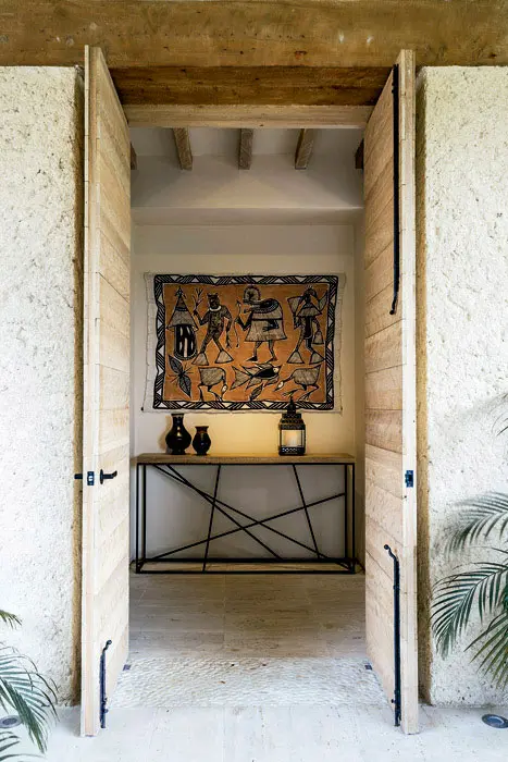 El sabor artesanal de estas piezas se alterna con otras contemporáneas, y todo el conjunto comparte una gama de tonos naturales como el blanco del algodón y el marfil, el ocre del mimbre y la madera, el marrón del cuero y el negro de los accesorios de hierro fundido.