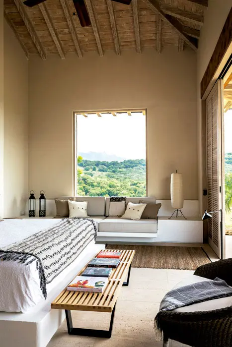 Aparentemente rústica, la casa tiene sutilezas de diseño como las puertas pivotantes y correderas que instalaron sin marcos para no interrumpir la continuidad de los muros; las celosías de roble rústico en las ventanas que controlan la luz y permiten el paso del aire, y la madera de los cielorrasos y de las estructuras de cubierta trabajada con un acabado tipo wash que le da un sosegado tono de ceniza.
