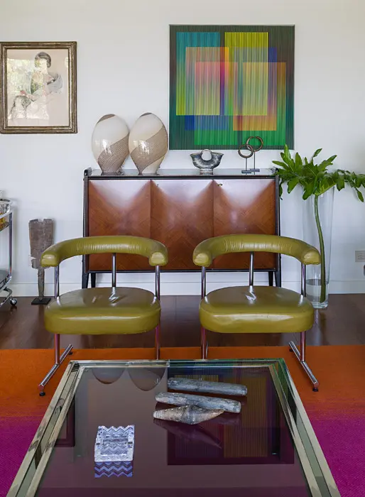 Este apartamento de 240 metros cuadrados es un universo propio y parece un lugar de otra época. En realidad podría ser una cápsula del tiempo en la que estratégicamente se guardaron y se conservan objetos, obras de arte, piezas de colección. Sus áreas son bien definidas y, opuesto a lo que podría considerarse una tendencia actual, no es minimalista, no integra espacios y por el contrario, cuenta con muros y paredes que determinan las zonas. Su ingreso es en medio de bibliotecas, lo que genera la sensación de entrar en una librería. Esto marca una diferencia con otros apartamentos y en la medida que uno lo recorre, se hace evidente el gusto de sus dueños en cada rincón. Arriesgados, modernos, clásicos, contemporáneos, coleccionistas.