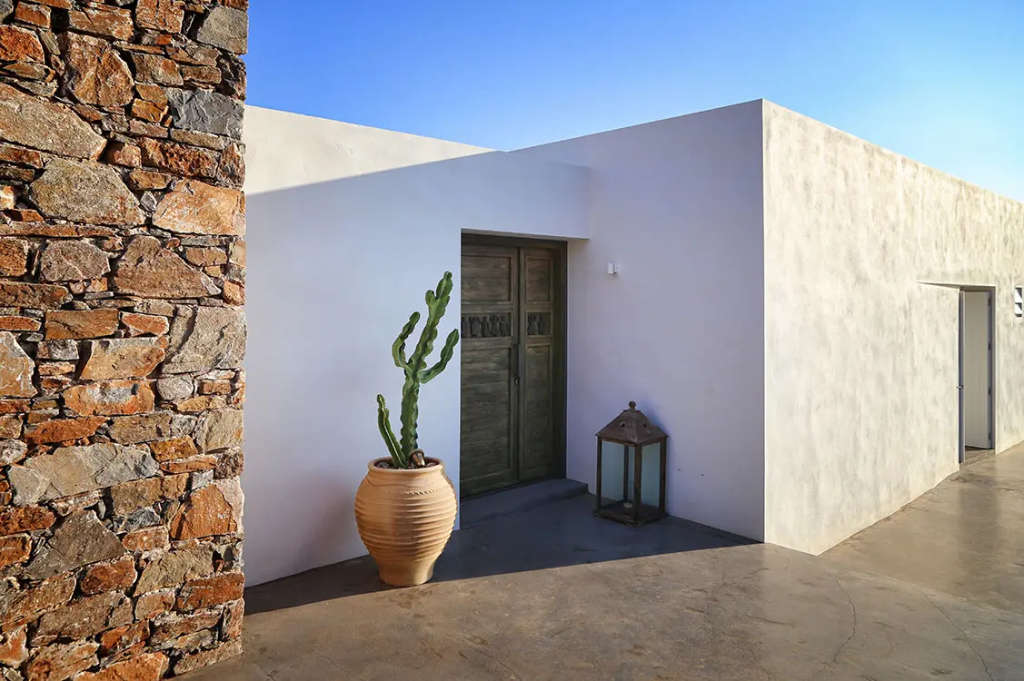 Construida en 2014, esta propiedad de 400 metros cuadrados y cinco habitaciones se adapta al contorno de la montaña, con la entrada en la parte posterior de la estructura. Un camino angular conduce a través de patios mediterráneos y cálidas fachadas de piedra a la puerta principal, una imponente pieza de madera rústica, con adornos de hierro. Un jarrón griego de terracota y una linterna anteceden la puerta, que una vez abierta revela increíbles visuales al mar y al paisaje, dándole al visitante una agradable bienvenida.