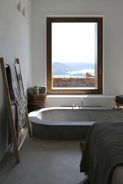 Los dueños de esta casa, situada en una ladera rocosa, sinónimo de un paisaje griego, buscaban un diseño que se integrara sutilmente con su arquitectura tradicional, pero que fuera moderna a la vez. Esto resultó en una balanceada mezcla entre texturas ásperas y suaves, y una paleta de color que va desde los cálidos ocres de la piedra local y madera sin tratar, hasta muros blancos y el gris grafito de las superficies de cemento brillado.