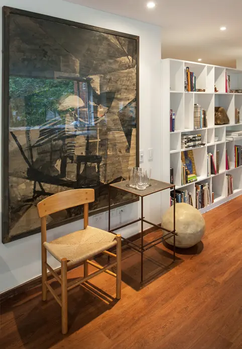 Para integrar la sala con el salón y el corredor con la sala, se optó por bajar el espaldar de los sofás y por crear un mueble de doble crujía que cumple dos funciones: por un lado es un estudio con computador y por el otro una funcional biblioteca. “Queríamos que fuera muy bajo el espaldar de los sofás para no perder la vista y que todo pudiera apreciarse correctamente”, sostienen los dueños. La carpintería de color café, que estaba en buen estado, también se trabajó. Para no pelarla y maltratarla con el proceso, Sokoloff decidió pintarla de blanco, un color que aportó más luminosidad al lugar. “En una remodelación cambiar la carpintería puede ser lo más costoso, por eso hay que tratar de conservarla”, señala el arquitecto.