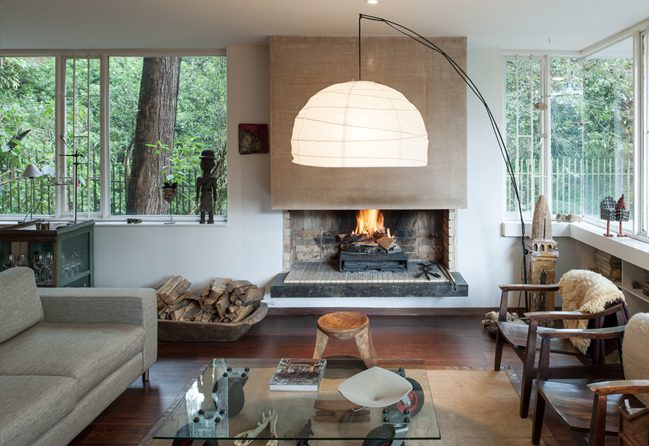 La chimenea, que era más pequeña y tenía vigas encima, se transformó a petición de los propietarios en una estructura compacta con un particular sistema de ventilación que permite la entrada de aire frío por debajo y salida de aire caliente por arriba. “No hay nada más rico que el olor a leña y que el sonido del fuego explotando –afirman los dueños–. Por eso no quisimos una chimenea de gas”.