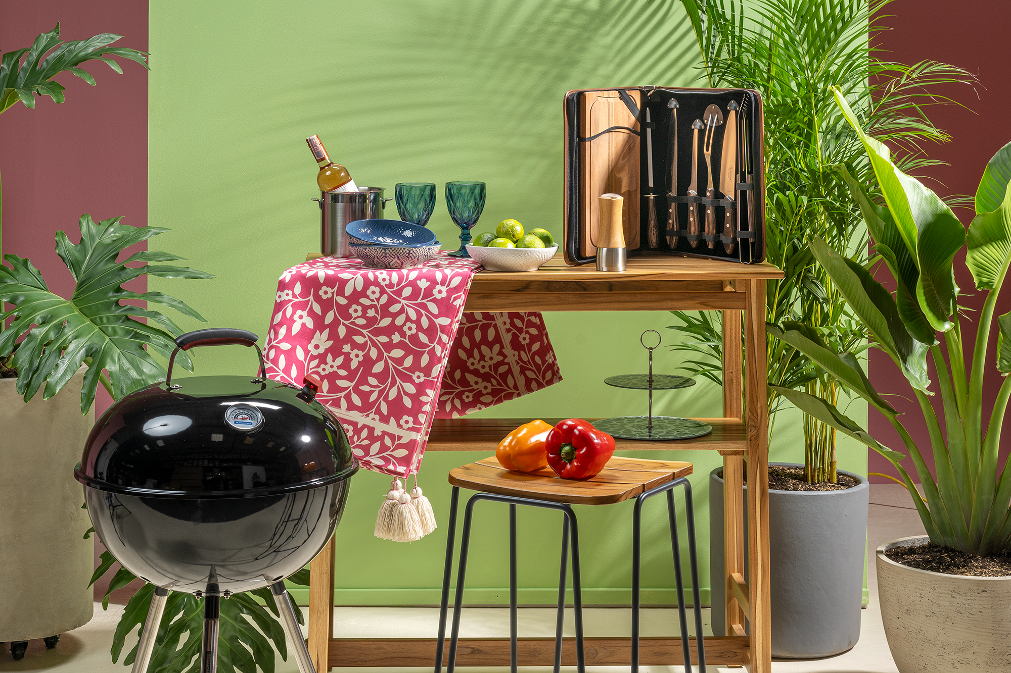 El mantel de seis puestos que observa en la imagen es la referencia Garden Pink que se complementa perfecto con copas vintage en azul; bowls en azul; bowl blanco; bandeja de dos niveles estampada, en la parte inferior, todo lo anterior de Interiority. Adelante, banco alto, ref. Tarsilia; grill de carbón, ambos de Tramontina.