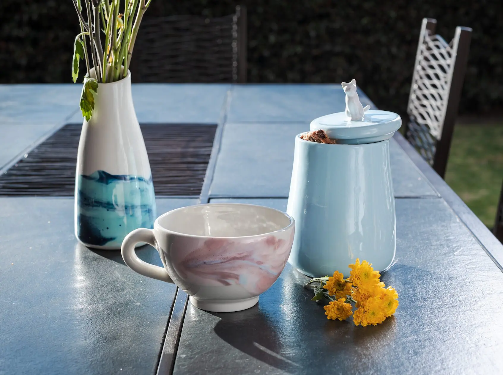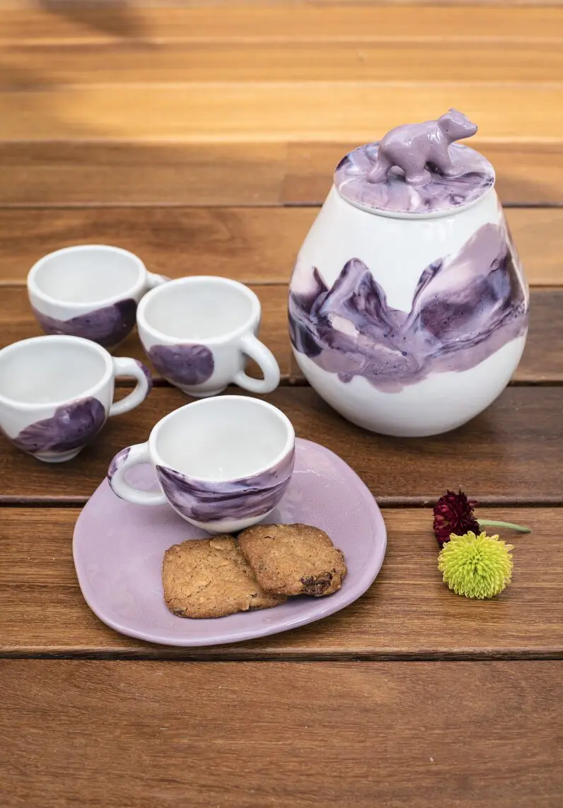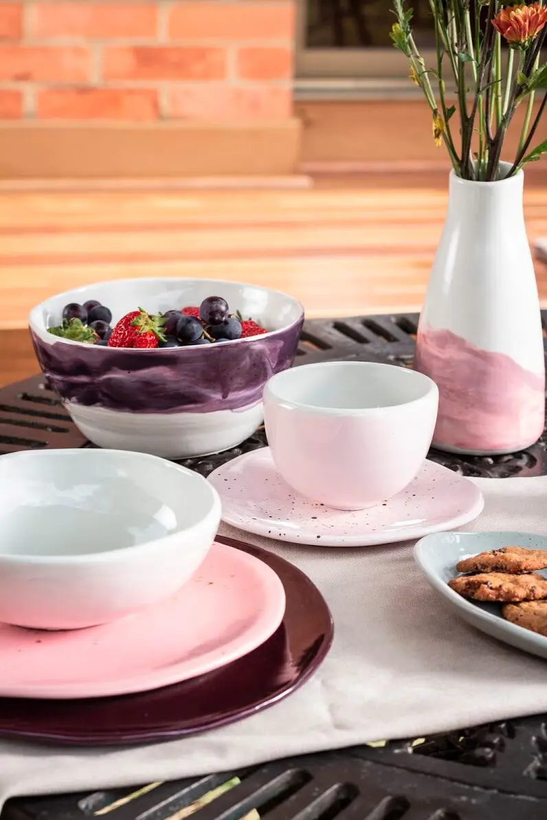 “Luego del primer año nos pasamos a un taller más grande, compramos hornos nuevos y definimos la materia prima y la paleta de colores”, explica Juliana. Sus vajillas están inspiradas en lo natural, en lo artesanal. Sus formas son orgánicas, alejadas de las ilustraciones y acompañadas por tonos vivos: “Somos personas alegres y nos gusta reflejar eso”. Para su nueva colección crearon formas abstractas y coloridas, con el objetivo de que cada pieza sea única. “No podemos manejar el resultado final, debido a que la cerámica se quema a 1.200 grados centígrados y los colores en altas temperaturas tienen una reacción diferente, por eso pueden variar. Siempre es una sorpresa cómo van a salir. Es un proceso difícil de controlar”.