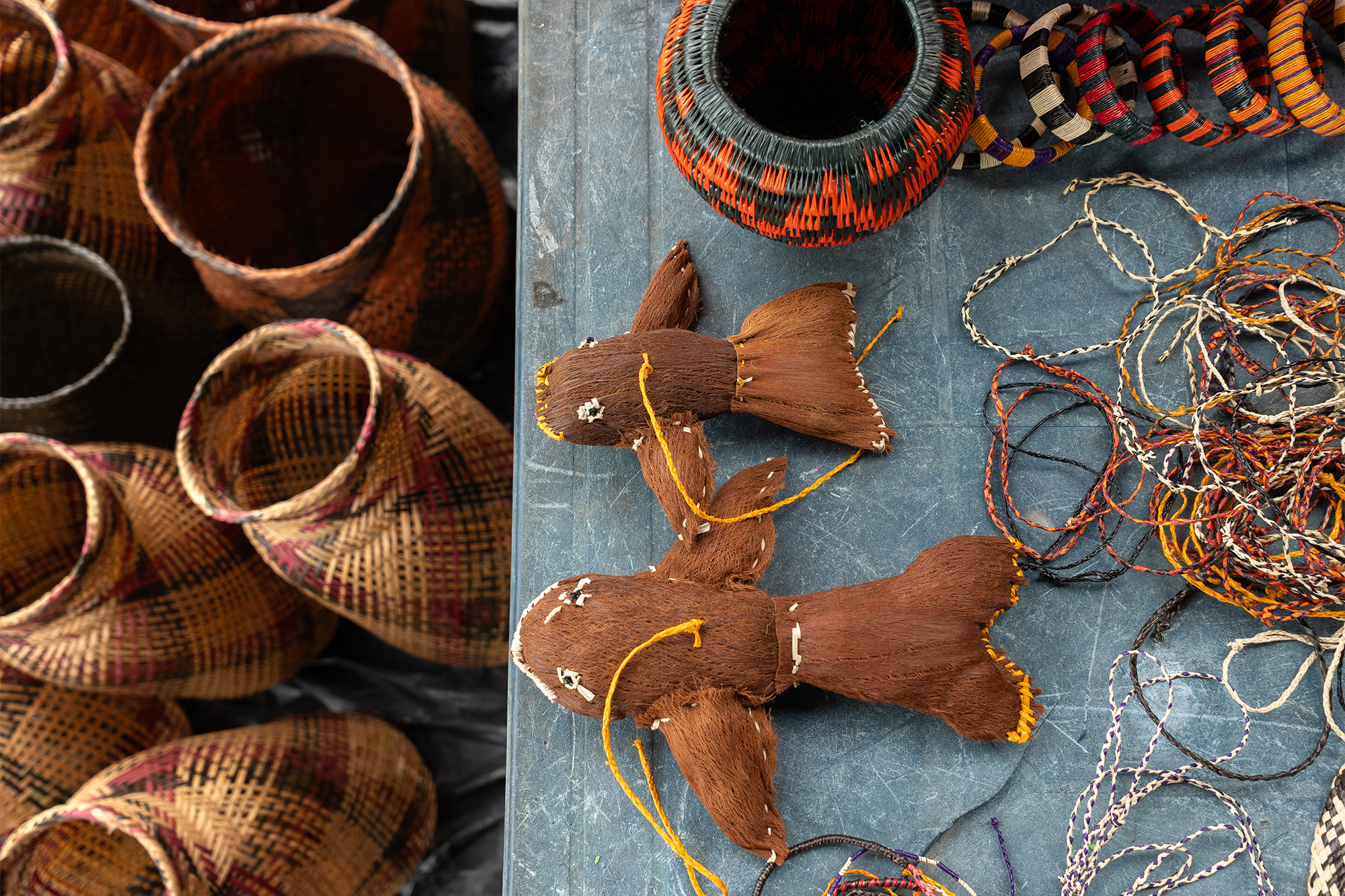 Son las mujeres quienes, por lo general, tejen canastos tan ceñidos que sirven incluso para cargar agua. Los diseños narran situaciones de la vida cotidiana y hacen referencia a elementos naturales y creencias del pueblo wounaan.