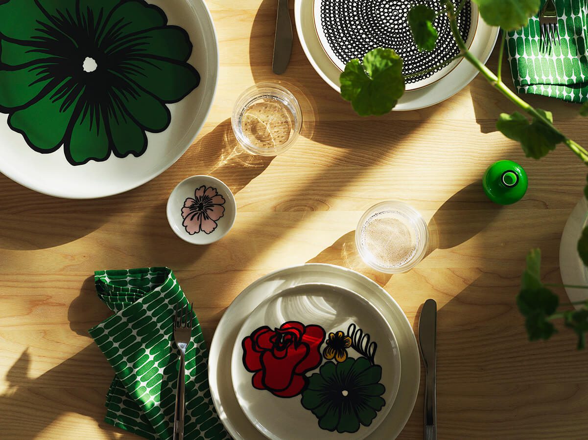 La colorida colección hogareña celebra la buena vida y los momentos cotidianos con objetos de mesa de primavera y verano. “Ofrece la oportunidad de vestir el hogar con flores que nunca se desvanecen”, añade el equipo de diseño. Los colores de la colección crecen desde los pasteles delicados hasta la plena floración de la temporada de verano. Los primeros en llegar de la colección incluyen la favorita de la casa Unikko (amapola) en su nueva combinación de colores pastel, mientras que la última gota de la temporada presenta frescos grabados de archivo de Fujiwo Ishimoto.