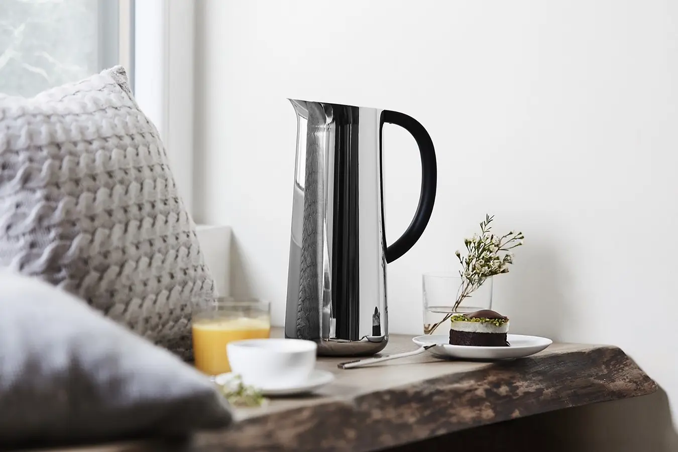 Ideal para aquellos que siempre están en movimiento. un objeto práctico, perfecto para tener en casa o llevar consigo la jarra de doble pared con aislamiento térmico en acero inoxidable 18/10 pulido y resina termoplástica, así como el termo, se convierten en el acento de diseño exacto y utilitario de uno de los diseñadores más representativos de Japón dentro de la oferta de la marca italiana.