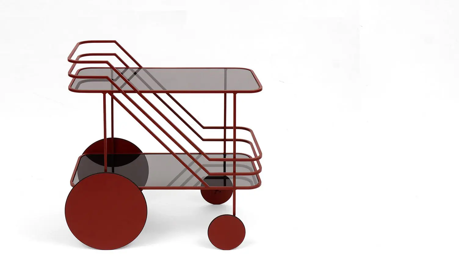 Inspirado al carro clásico de servicio de azafatas, esta pieza de diseño minimalista con un toque de Art Déco llega a lo esencial del diseño limpio. Se lanzó al mercado este año durante el Salone Del Mobile de Milán en el stand de la marca DANTE-Goods And Bads . Mide 80 x 35 x 80 cm. y viene en acero con recubrimiento en polvo en negro, blanco, burdeos, champán. Presenta dos superficies horizontales en vidrio templado para aumentar la capacidad.
