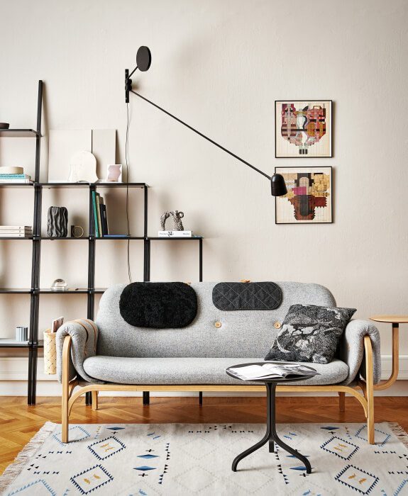 «Queríamos que el sofá expresara el patrimonio escandinavo tan presente en la historia de Swedese « , comentan las diseñadoras. Su marco en roble o ceniza soporta accesorios como los cojines  de tela, cojín de piel de oveja  grafito o negro una  mesa auxiliar y un porta revistas.Capsulas de diseño: sofá button de front